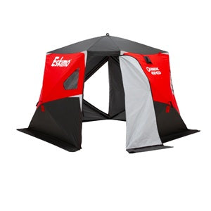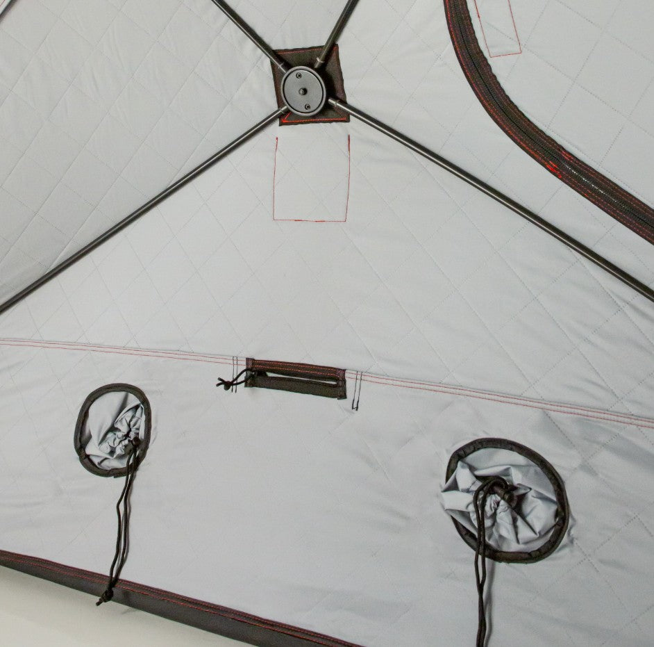 Once you’ve found a spot and popped up the shelter, the full panel No-Trip Door makes gear load-in quick and easy. Power up your heat source, and fish within the comfortable confines of our premium StormShield™ insulation. We find that the right insulation is key to using less heat source fuel and reducing interior condensation, so you can take your jacket off and get comfortable. Propane lines can be run through the included zipper port, while air ducts can be run through the pair of integrated heat ports to utilize ventilated options, such as a diesel heater. If it’s nasty outside, ice anchors and deluxe cam straps are included to secure each exterior corner and hub simultaneously. You won’t miss anything going on outside through the extra-large windows placed at eye level, with cover flaps that stow conveniently in attached pockets. Fish for as long as you want, wherever you want with the shelter that does everything you need to create your own set of memories on the ice.
