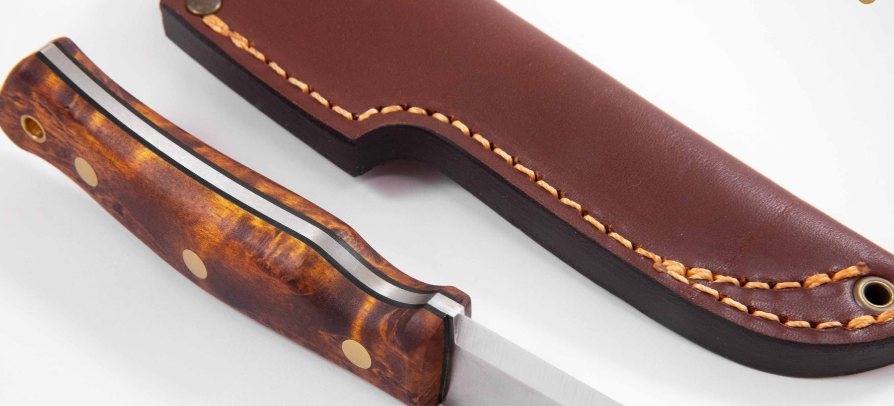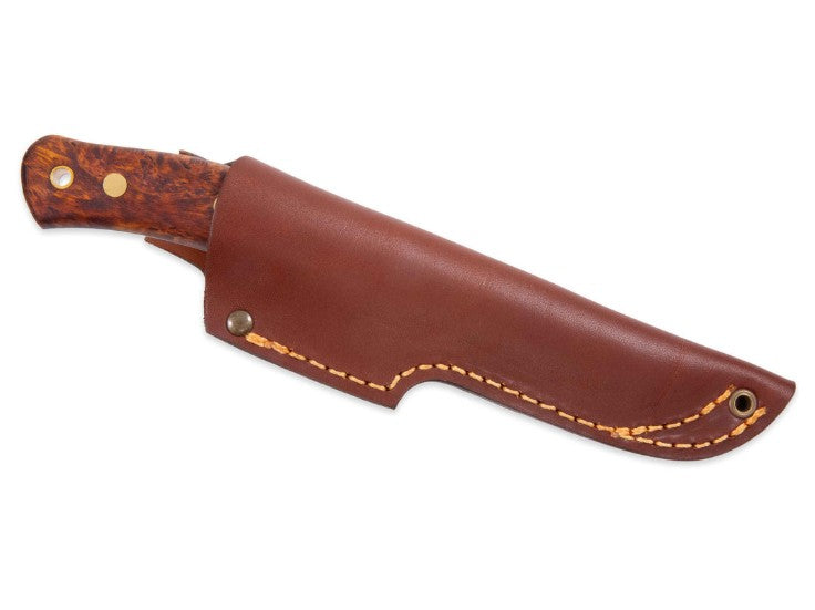 - Handle: Brown-Stained Curly Birch (sustainable forestry), black liners, brass rivets