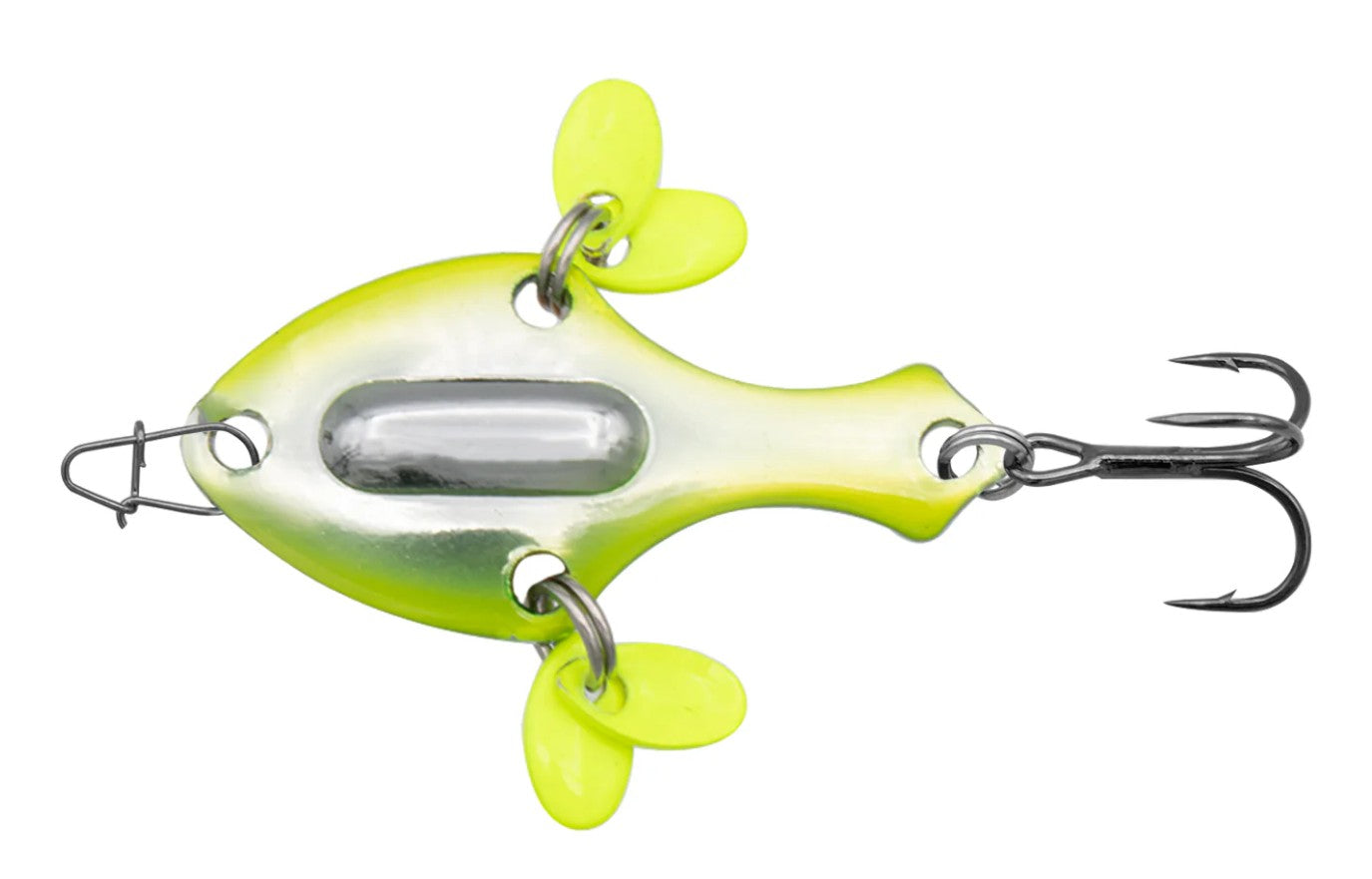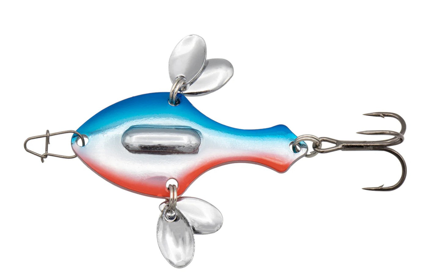 The internal rattle chamber is placed centrally so it doesn’t impact the fluttering action and offers a symetrical balance. The micro blades, on top of their visual effect, generate an additional sound attraction. The blades are designed to complement the overall color patterns of the individual spoons, while maintaining some contrast from the spoon itself.